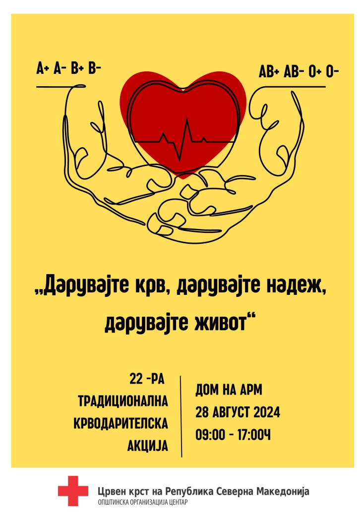 Shkup, 28 gusht – Kryqi i Kuq i Republikës së Maqedonisë së Veriut – Organizata komunale Qendër dhe Instituti për transfuziologji i RMV-së, sot, për të 22-tën herë do të orgnaizojnë aksion të dhurimit të gjakut me rastin e festës së ShënMërisë.