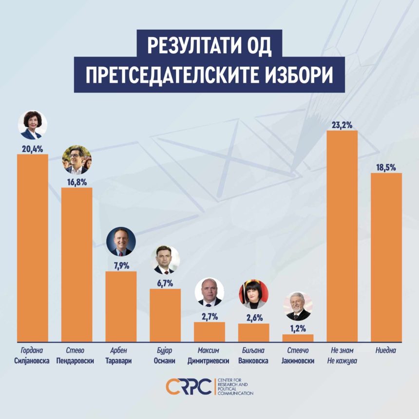 Për kandidaten e VMRO DPMNE Gordana Siljanovska Davkova do të votonin 20,4% e të anketuarve, ndërsa për konkurrentin e saj kryesor, presidentin aktual Stevo Pendarovski nga LSDM-ja, 16,8% e të anketuarve do të jepnin votën e tyre.