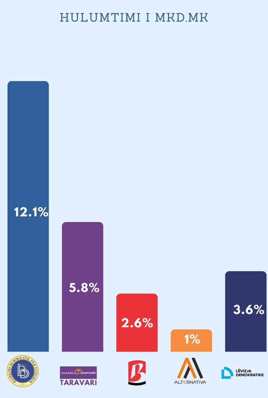 Shkup, 26 prill – Një anketë e shpërndarë nga anëtarët e Bashkimit Demokratik për Integrim në rrjetet social Facebook, e zhvilluar nga MKD, në rrastë nesër të ketë zgjedhje parlamentare cilën parti politike shqiptare do të votoni, rezultatet dalin si në vijim, shkruan Zhurnal.mk
