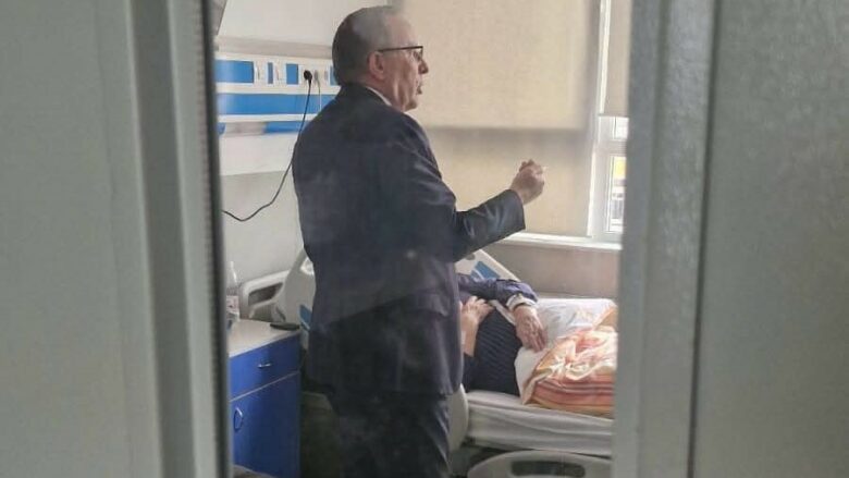 Në një fotografi, shihet Bedri Hamza në dhomën ku po qëndron Haxhi Thaçi, babai i ish-presidentit Thaçi, i cili po trajtohet nga mjekët e spitalit publik.