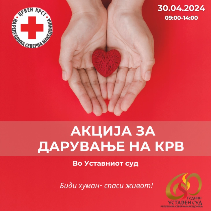 Shkup, 30 prill – Nën moton “Bëhu human – shpëto jetë” Gjykata Kushtetuese organizon aksion për dhurimin e gjakut, që do të mbahet sot, në periudhën nga ora 9 deri në 14, në hapësirat e Gjykatës.