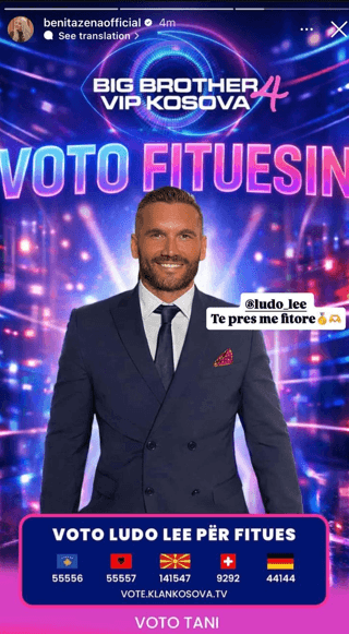 Përmes një fotografie të publikuar në InstaStory, Benita i ka dërguar një mesazh mbështetjeje Ludo Lee-s, duke lënë të kuptohet se ai është personi që ajo dëshiron ta shohë triumfues.