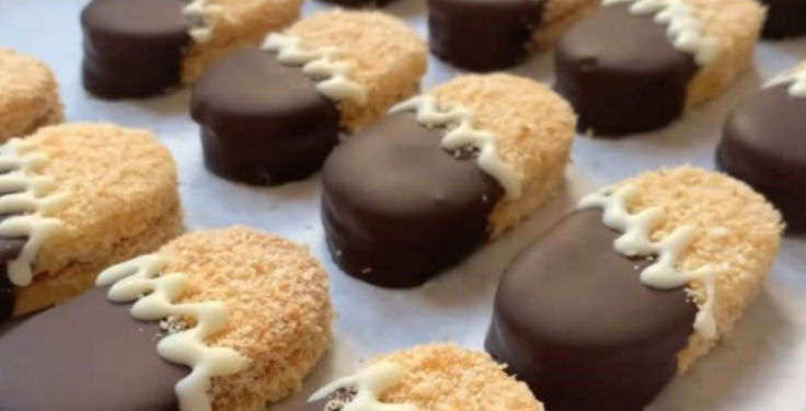 Gjysmën e biskotave lyeni me çokollatë, gjysmën tjetër me reçel dhe spërkatini me kokos.