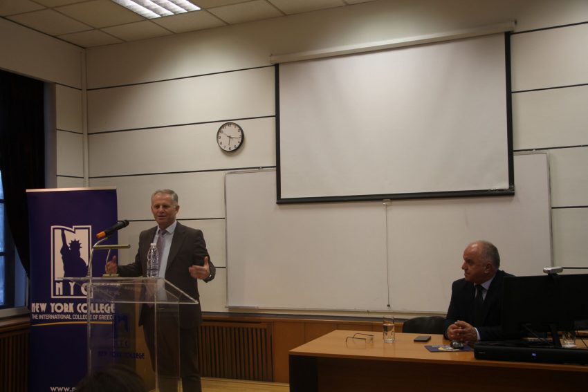 Ai ishte i ftuar në Kolegjin e Nju York-ut në Athinë, ku ligjëroi dhe bashkëbisedoi me studentë. Prezent, ishin edhe ambasadorë e përfaqësues diplomatikë në Greqi, nga rajoni e më gjerë.
