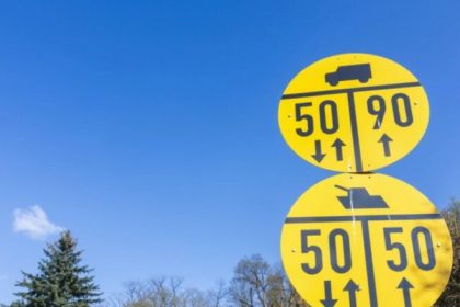 Një shenjë trafiku rrethore, e zezë dhe e verdhë me një siluetë…
