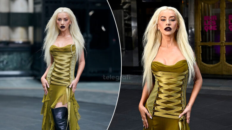 Christina Aguilera, 44 vjeçe, mahniti publikun me një fustan ngjyrë ulliri pa rripa, ndërsa mori pjesë në prezantimin e Burlesque: The Musical në Teatrin Savoy në Londër.