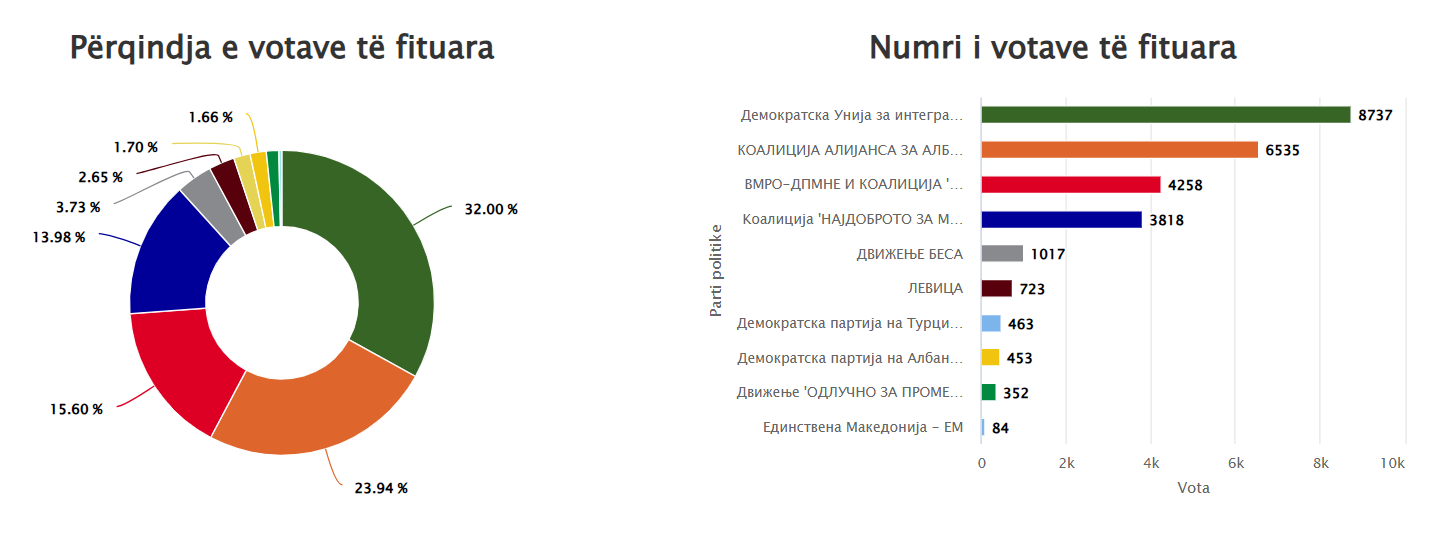 VLEN ka marr 4.595 vota, Fronti Evropian 10.244 vota. Ndërkaq, VMRO 6.931 vota. Nga këto rezultate qartësisht mund të kuptojmë se përkrahja e cilës parti politike mund ta thellojë diferencën edhe më shumë, ta sigurojë fitoren ose t’i përmbys fituesit e zgjedhjeve të fundit.