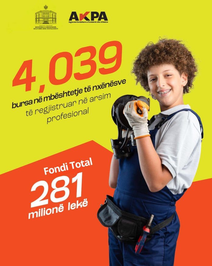 Ministri i Ekonomisë, Kulturës dhe Inovacionit, Blendi Gonxhja i bëri të ditur sot se 4039 bursa janë shpërndarë në mbështetje të nxënësve të regjistruar në arsim profesional me një fond total prej 281 milionë lekësh.