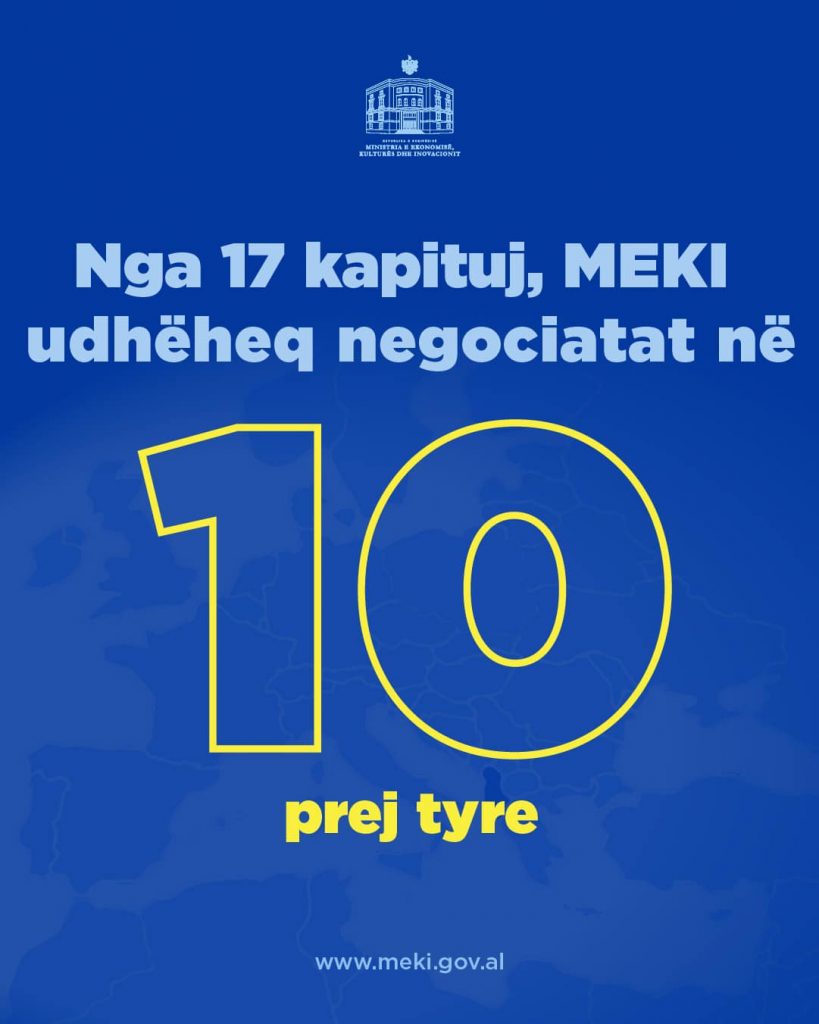 Ministri i Ekonomisë, Kulturës dhe Inovacionit, Blendi Gonxhja, bëri të ditur sot përmes një postimi në rrjetet sociale se nga 17 kapituj negociatash, ministria që ai drejton udhëheq bisedimet në 10 prej tyre, duke luajtur një rol kyç në këtë proces.