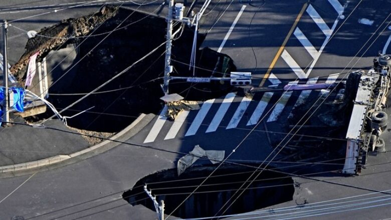 Një gropë që vlerësohet të jetë me madhësi të një pishine të madhe, ka “gëlltitur” një kamion dhe shoferin derisa u hap befasisht në mes të një rruge tejet të frekuentuar në Japoni.