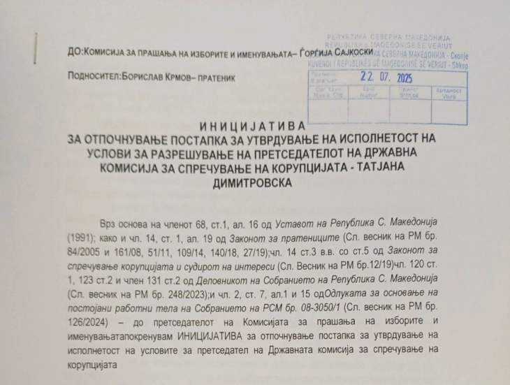 Shkup, 23 korrik – Deputeti i Të Majtës, Boris Kërmov ka paraqitur nismël për shkarkimin e kryetares së Komisionit Shtetëror për Parandalimin e Korrupsionit, Tatjana Dimitrovska, në Komisionin për Zgjedhje dhe Emërime.