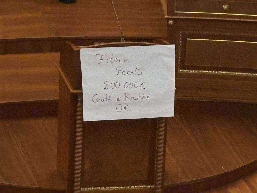 Reading: Kadrijaj vendos një pankartë në Kuvend: “Fitore Pacolli 200 mijë euro, Gratë e Krushës 0 euro”