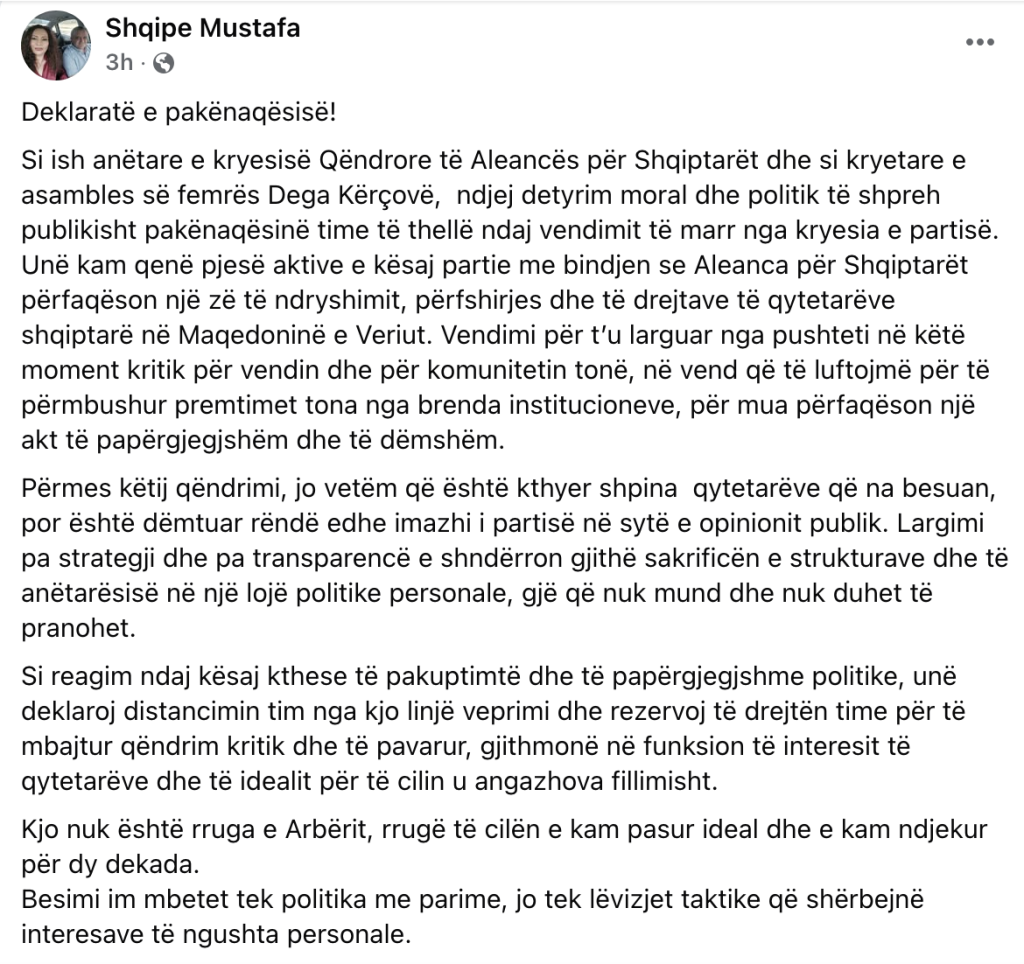 Kërçovë, 14 maj – Shqipe Mustafa, ish-anëtare e Kryesisë Qendrore të Aleancës për Shqiptarët dhe kryetare e Asamblesë së Gruas në Degën e Kërçovës, ka shpallur publikisht distancimin e saj nga drejtimi aktual i partisë që udhëhiqet nga Arben Taravari.