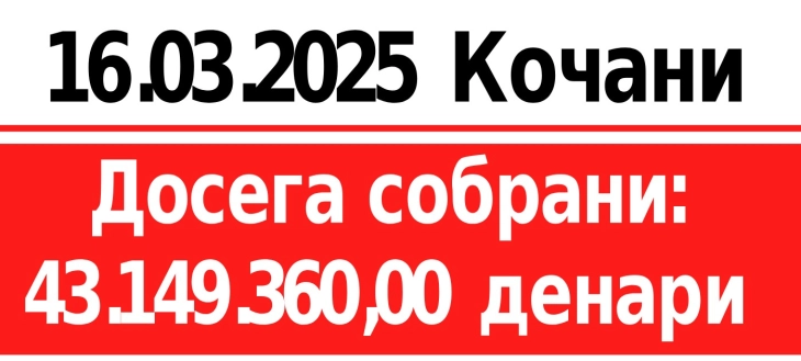Shkup, 21 mars – Kryqi i Kuq i Maqedonisë së Veriut informon se deri tani janë grumbulluar 43.149.360 denarë për mbështetjen e të pësuarve nga zjarri në Koçan dhe familjeve të tyre.