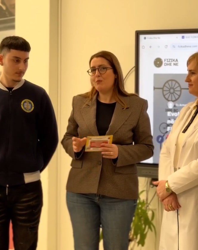 Ministrja vlerësoi orën mësimore, duke theksuar se “ka marrë pjesë në një projekt inovator, që përmes koncepteve të fizikës, të mbledhura bashkë, duke përdorur edhe Inteligjencën Artificiale, bibliotekën dixhitale, librat, tekstet e shkollës, revistat kanë çuar në krijimin e një faqe web-i siç është “Fizikadhene”.”