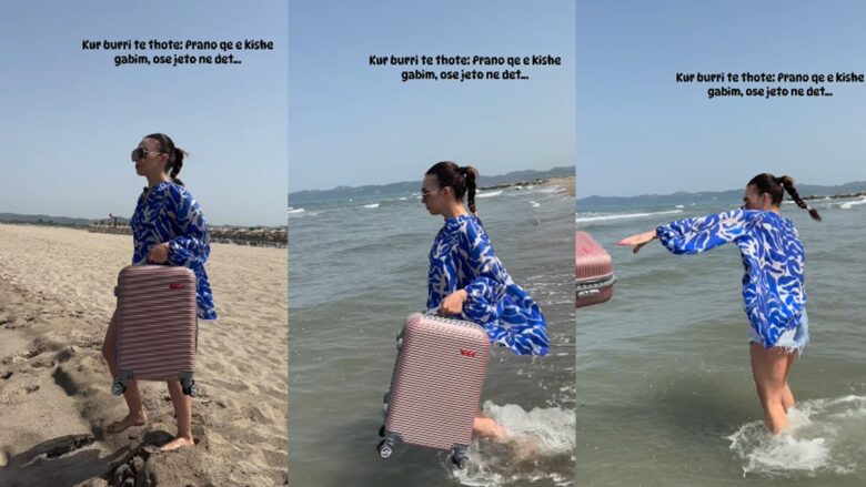 Jonida më pas shfaqet me një valixhe në dorë që ecë drejt plazhit dhe në fund zhytet në ujë.