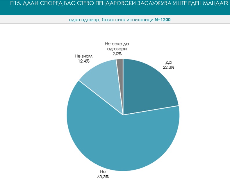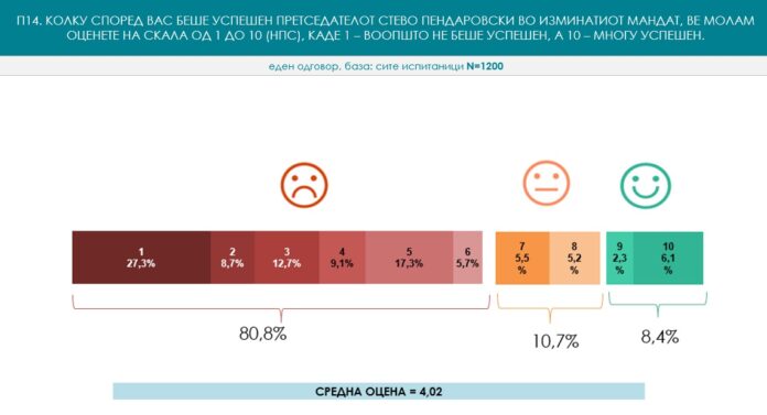 Vlerësimi për punën e presidentit aktual të shtetit Stevo Pendarovski në shkallë nga 1 deri në 10 është 4,02. Kjo notë për punën e Qeverisë është 3.03. Pakënaqësia me punën e Pendarovskit vërehet edhe në përgjigjen e pyetjes se a e meriton mandatin e dytë – “jo” janë përgjigjur 63,3%, ndërsa “po” janë përgjigjur 22,3%.