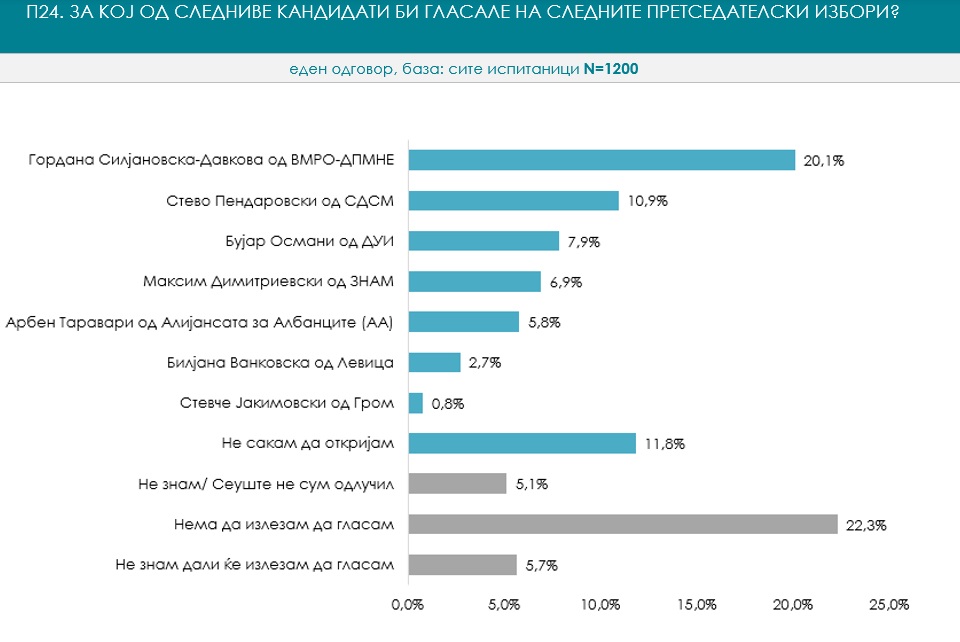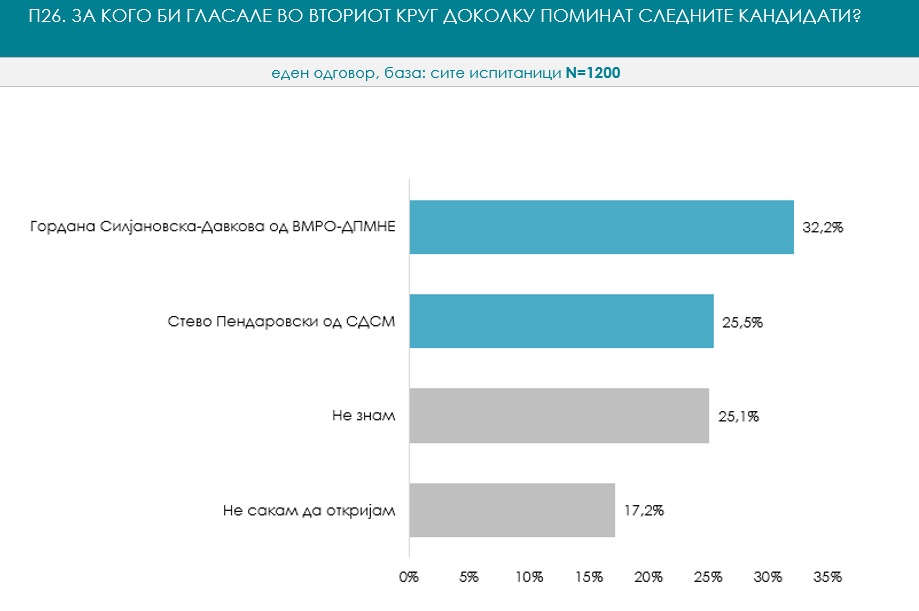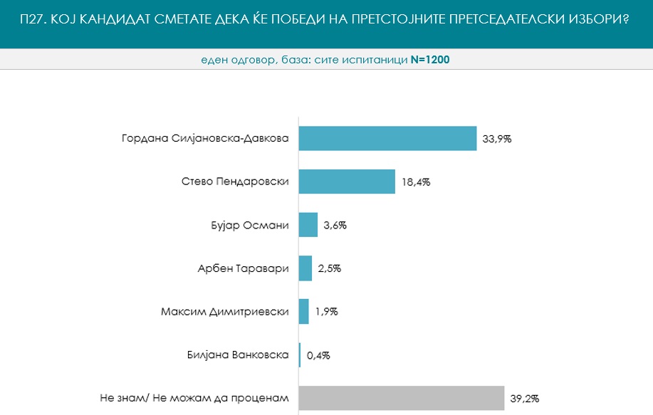 Sipas anketws, përparësia e Siljanovska-Davkovws ndaj Pendarovskit është gati 2:1. Interesant është dueli mes kandidatëve në bllokun shqiptar, Bujar Osmani dhe Arben Taravari. Për Osmanin si kandidat të koalicionit të BDI-së do të votonin 7.9%, ndërsa Taravarin si kandidat të opozitës shqiptare 5.8%. Kandidati presidencial i ZNAM-it, Maksim Dimitrievski, është i pozicionuar me 6,9 për qind të anketuarve, që nënkupton vendin e tretë në mesin e kandidatëve maqedonas. Në përgjigjen e lirw të anketës se cilit politikan i besojnë mw shumw, Dimitrievski është edhe para Pendarovskit.