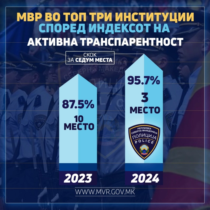 Shkup, 14 gusht – Në raportin vjetor për Indeksin e Transparencës Aktive për vitin 2024, Ministria e Punëve të Brendshme shënon progres të madh nga 87,5 për qind për vitin 2023 në 95,7 për qind për vitin 2024.