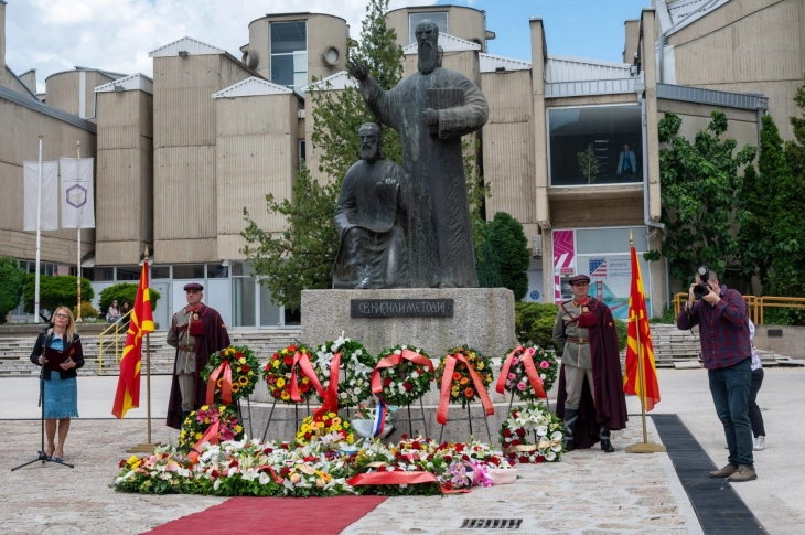 Siç njofton Qeveria e RMV-së, delegacioni qeveritar I kryesuar nga Kaja Shukova, ministre e Mjedisit Jetësor dhe Planifikimit Hapësinor dhe Mitko Bojmacalijev, zëvendësministër plotësues I Punëve të Brendshme, vendosën lule në monumentin Shën Cirilit dhe Metodit, në platonë para Universitetit “Shën Cirili dhe Metodi” në Shkup dhe bënë homazhe për veprën arsimore të vëllezërve të shenjtë, me rëndësi themelore për gjuhën, identitetin dhe kulturën maqedonase.