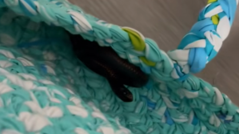 Së bashku me përshkrimin, është bashkangjitur edhe videoja ku shihet gjuetari teksa e kap gjarprin nga një çantë në cep të dhomës.