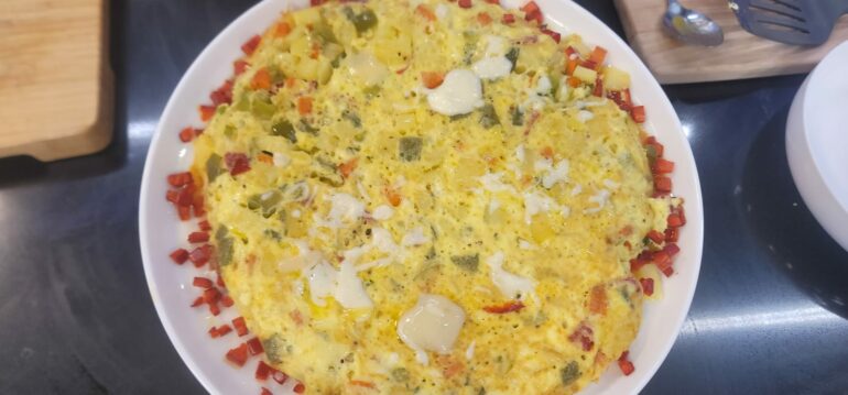 4. Pjekja: Hidhni përzierjen në një tavë të lyer me pak gjalpë dhe piqeni në furrë të parangrohur në 180°C për rreth 25-30 minuta, derisa omleta të jetë pjekur dhe të ketë marrë një ngjyrë të artë.