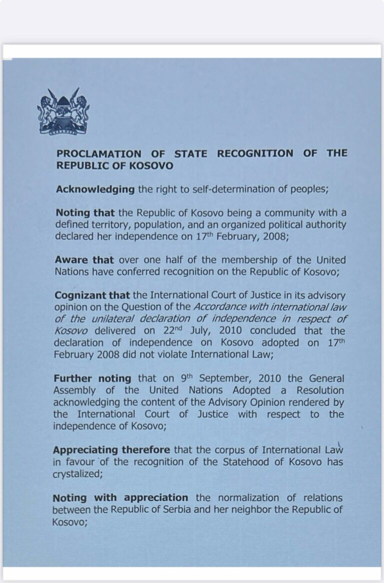 “Presidenti Ruto vazhdimisht siguronte popullin e Kosovës se vendimi për njohje do te merret shpejt, bazuar në të drejten nderkombetare dhe ne sakrificen e gjate te popullit tone”.