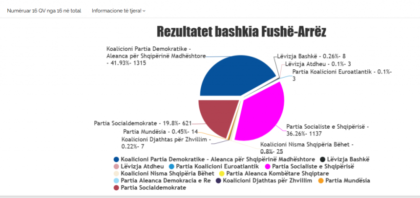 Në 16 qendra votimi të bashkisë Fushë-Arrëz, Partia Socialdemokrate ka marrë 621 vota ose 19.8%, Partia Mundësia 14 vota ose 0.45%, Koalicioni djathtas për zhvillim 7 vota ose 0.22%, Lëvizja Bashkë 8 vota ose 0.26% , Lëvizja Atdheu 3 vota ose 0.1%, Koalicioni Nisma Shqipëria bëhet 25 vota ose 0.8%, Partia Koalicioni Euroatlantik 3 vota ose 0.1%.