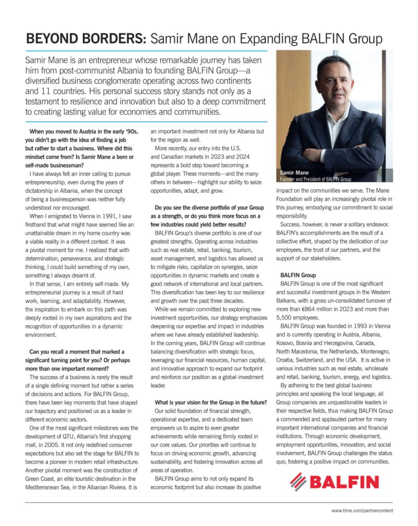 Pikërisht në këtë mënyrë hapet intervista ekskluzive e Manes, ku ky i fundit ndalet në të shkuarën, në sfidat e kohës dhe në vendosmërinë dhe këmbënguljen e tij për t’u identifikuar nga hera si një vizionar në botën e biznesit, duke ndërtuar dhe fuqizuar Grupin BALFIN.