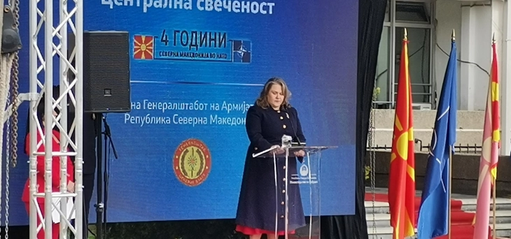 “Historia jonë tregon se ne promovojmë stabilitet, barazi dhe dialog. Si anëtare e Aleancës, ne duhet të jemi të gatshme dhe të përgjegjshme për të forcuar sistemin e qëndrueshmërisë së shoqërisë sonë. Është një sfidë serioze që duhet ta tejkalojmë”, tha Petrovska dhe theksoi se Armata do të vazhdojë të zhvillohet dhe modernizohet sepse është shtylla e shtetit, ndërsa do të vazhdojë edhe investimi në kapitalin njerëzor – shtyllë e mbrojtjes.