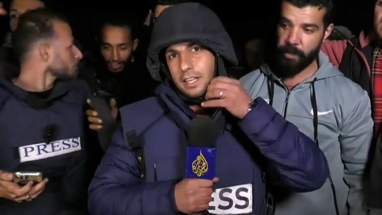 Anas al-Sharif gazetari i Al Jazeera ka hequr jelekun antiplumb si dhe helmetën, derisa po raportonte dhe njoftonte për armëpushimin e arritur mes Hamasit dhe Izraelit.