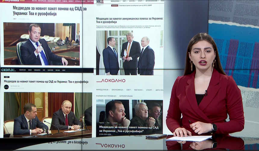 Për shembull, më 21 prill 2024, portali Republika botoi titullin: “Medvedev për paketën e re të ndihmës së SHBA-ve për Ukrainën: Kjo është rusofobi”. Të njëjtin titull e kanë botuar edhe portali “Lokalno”, si dhe portali “Skopje1”. Edhe portali MKD.mk ka publikuar titullin: “Medvedev për pakon e ndihmës amerikane për Ukrainën: Kjo është rusofobi”.