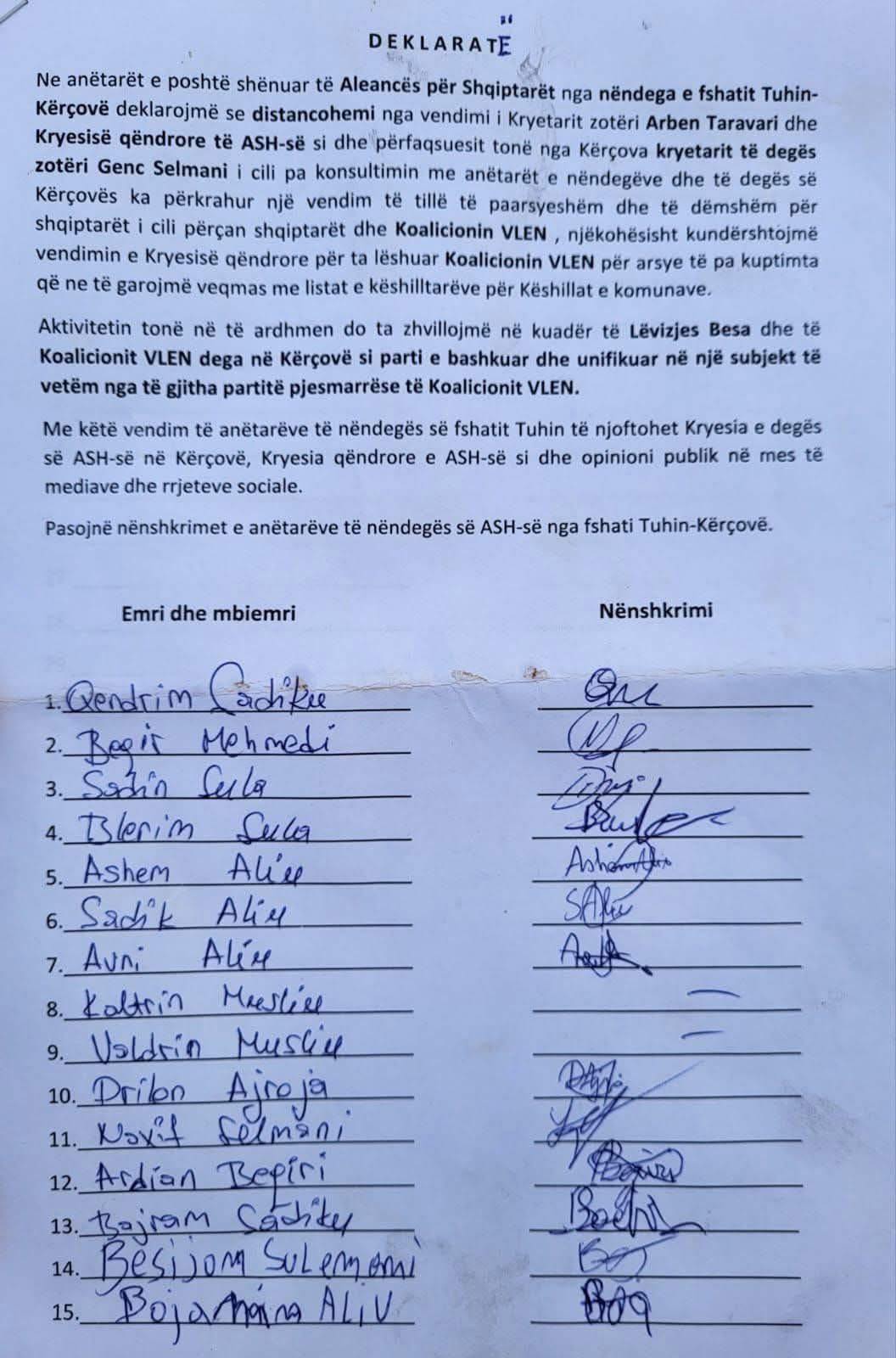 Kjo sapër ta dëmtuar një koalicion që e solli ndryshimin. Bënte veprime fëmijrore që pastaj të ankohet e viktimizohet se më dëbuan nga koalicioni. Liderët tjerë të VLEN treguan maturi dhe pjekuri politike vepruan menjëherë dhe ia stopuan aventurat Taravarit i cili përsërisim që bënte veprime sikurse të jetë i “dehur”. Pa i menduar pasojat e përfundimit.