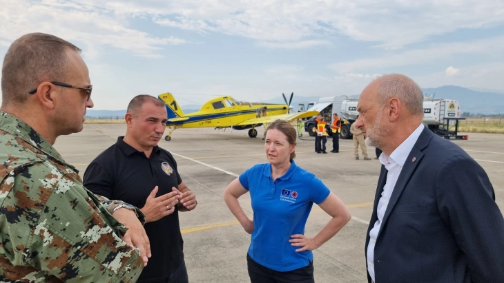 “Ambasadori evropian Gir dhe drejtori i QMK-së Stojançe Angellov nga ekuipazhet e helikopterëve dhe aeroplanëve të mbërritur përmes Mekanizmit të BE-së për mbrojtje civile u njohën me performancën dhe patën mundësinë të shohin aeroplanët para se të nisnin me qëllimet e tyre të planifikuara për sot”, kumtoi QMK-ja.