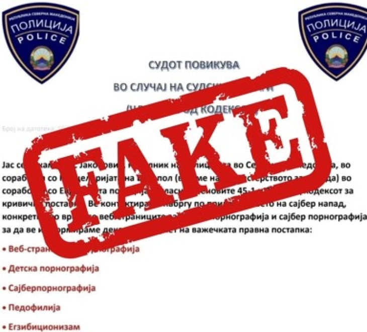 Shkup, 22 prill – Disa qytetarëve dhe personave juridikë, nga ana e kryerësve të cilët prezantohen rrejshëm në emër të MPB-së dhe EUROPOL-it, janë drejtuar ftesa të rreme kinse lidhur me një hetim vijues, informuan pasdite nga Ministria e Punëve të Brendshme, duke u bërë thirrje qytetarëve të jenë të kujdesshëm dhe të mos hapin mesazhe të dyshimta.