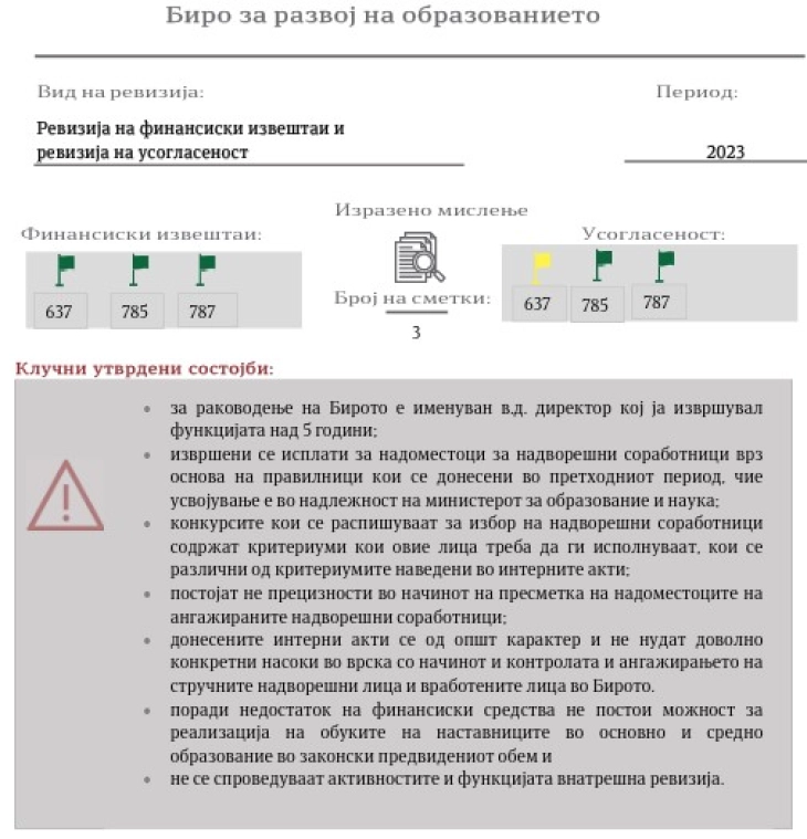 Shkup, 22 prill – Enti Shtetëror i Revizionit (ESHR) konstaton disa dobësi sistematike në punën e Byrosë për Zhvillimin e Arsimit, të cilat i publikon në raportin për Revizionin e kryer të parregullsive për vitin 2024.