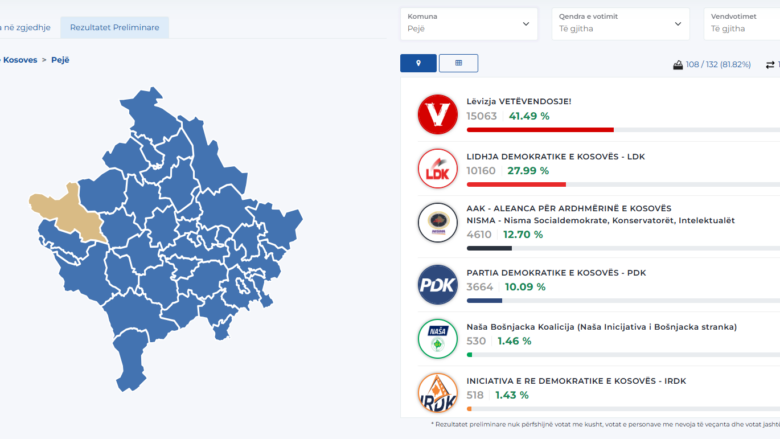 Në Komunën e Pejës deri më tani janë numëruar 81.82 për qind e votave, ku LVV ka marrë 41.49 për qind, LDK ka 27.99 për qind, PDK ka marrë 10.09 për qind dhe AAK-Nisma ka 12,70 për qind.