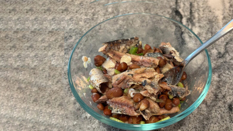 Në një enë të thellë shtypim sardelet me pirun, shtojmë fasulet, më pas qepën dhe i hedhim vaj, uthull dhe kripë.