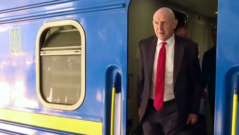 Ministri ukrainas i Mbrojtjes, Denys Shmyhal, njoftoi vizitën në Telegram dhe ndau një video të takimit të tyre në stacionin hekurudhor në Kiev, transmeton Telegrafi.