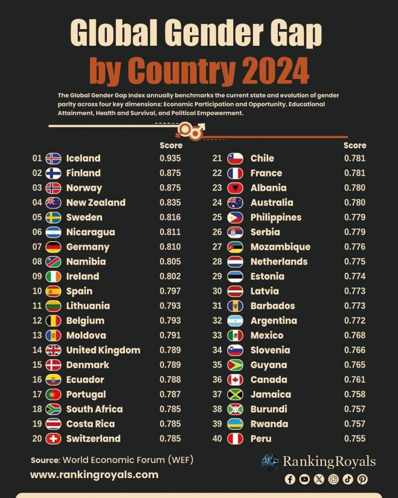 Shqipëria renditet e para në Ballkan, ndër të parat në Evropë dhe e 23-ta në botë në raportin e Hendekut Gjinor Global 2024 The Gender Gap, indeks që mat barazinë gjinore midis grave dhe burrave në 4 fusha kyçe.