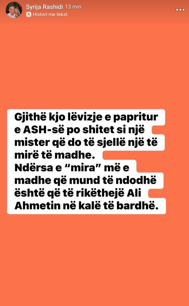 “Gjithë kjo lëvizje e papritur e ASH-së po shitet si një mister që do të sjellë një të mirë të madhe. Ndërsa e ‘mira’ më e madhe që mund të ndodhë është që të rikthejë Ali Ahmetin në kalë të bardhë,” shkruan Rashidi me ironi.