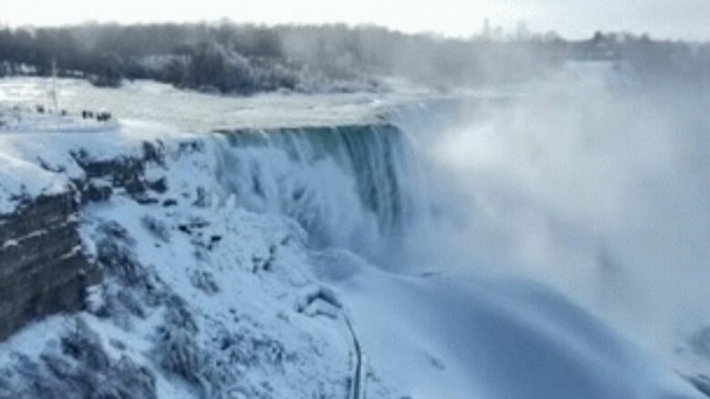 Pamjet e filmuara me dron tregojnë shtresa të trasha akulli dhe dëbore përreth Ujëvarave të Niagarës, të cilat sot përfaqësojnë kufirin midis SHBA-së dhe Kanadasë dhe janë një nga pesë destinacionet turistike më tërheqëse në botë.