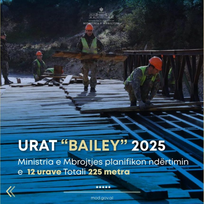 Ministri i Mbrojtjes, Pirro Vengu tha sot se gjatë vitit 2025, planifikohet që të ndërtohen 12 ura të reja “Bailey” në disa nga zonat e vendit, ku ato janë më të nevojshme. Urat, si pjesë që lidhin komunitetet, ndihmojnë jo vetëm në çështjet e sigurisë, por edhe në përmirësimin e jetës së qytetarëve në çdo cep të Shqipërisë dhe Ministria e Mbrojtjes dhe Forcat e Armatosura do të vazhdojnë misionin për ndërtimin e tyre.