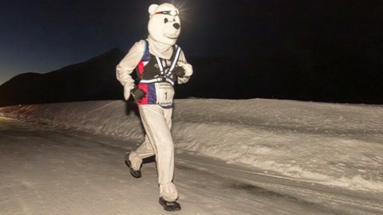 Një grua britanike veshi një kostum të ariut polar për të marrë pjesë në një maratonë të ftohtë norvegjeze dhe për të thyer një rekord botëror me kohën prej 4 orësh, 58 minutash dhe 29 sekondash.