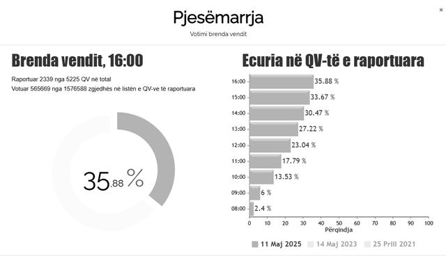 Komisioni Qëndror i Zgjedhjeve ka publikuar të dhënat e pjesëmarrjes në votime nga qytetarët ditën e sotme. Sipas përditësimit të KQZ-së, deri në orën 16:00, pjesëmarrja në rang vendi ka arritur në 35.88%.